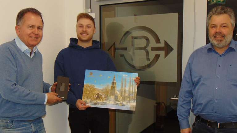 Niklas Schönewald (Mitte). Ludwig Kirchhoff-Stevens von Firma Rötelmann (links) und Lions-Präsident Michael Bölling (rechts) überreichten dem Herscheider das Smartphone. | Michael Koll - come-on.de